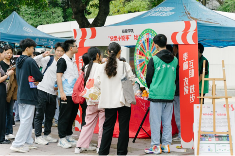 同学们在志愿服务摊位前参与活动
