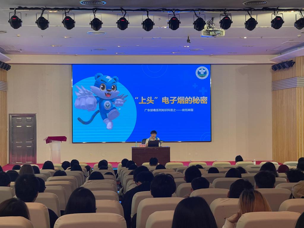 任德强社工通过现场展示毒品模型、播放视频讲解等方式向同学们详细讲解毒品基本概念、种类、危害、预防措施及禁毒相关法律法规知识,介绍了青少年吸毒的诱因,使同学们认识到毒品的危害性以及禁毒工作的重要性,重点向同学们讲解了各类毒品替代物的防范知识点,特别是“依托咪酯”对人身体的危害以及如何防范的相关知识,同时引导同学们要学会识别和警惕其他伪装毒品。